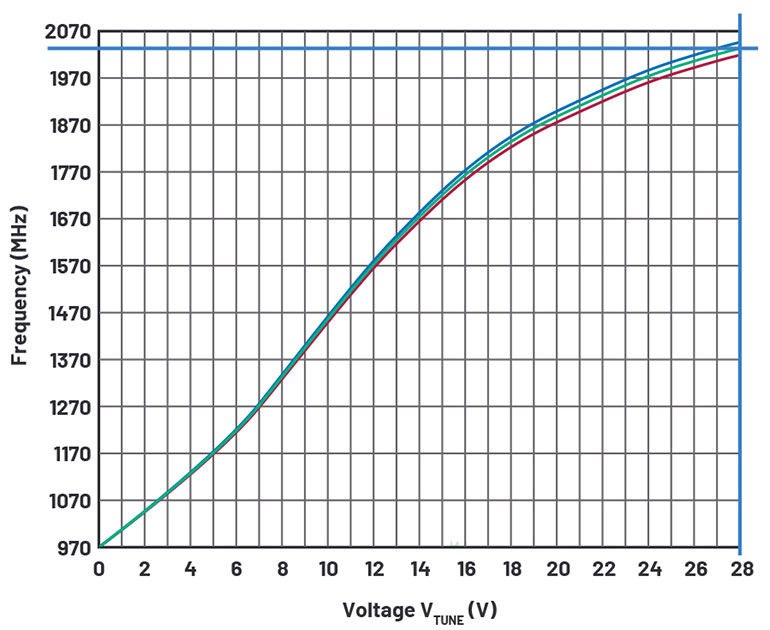 例如,可以將Synergy Microwave CorporationDCYS100200-12 用作VCO。如圖3的曲線所示,它以28 VV TUNE)抽出2 GHz的頻率
