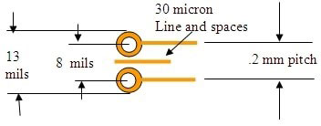 使用新的微電路設計技術(shù)代替常規(guī)的印刷電路技術(shù)可節(jié)省大量的空間。如今,典型的75微米線寬的最佳間距約為.5mm,通過75微米線和250微米(10mils)的焊盤可得到75微米(3mils)。墊片之間的間距為225微米(9mils),墊片之間僅允許一條75微米的線,對于大多數(shù)商店來說,這種最小規(guī)格是很難的。