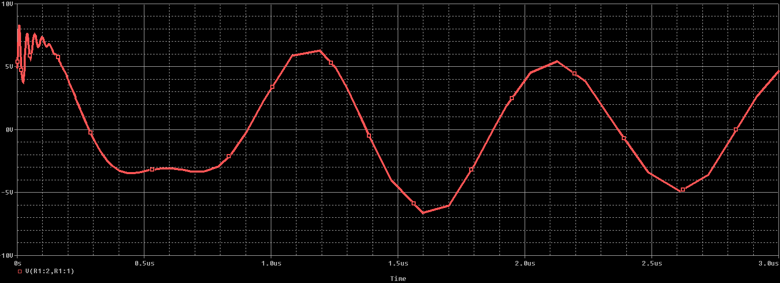 下面顯示的瞬態(tài)分析結果說明了模擬電路的靈敏度-1 MHz信號最初顯示出輕微的瞬態(tài)響應,峰值幅度高達8V。接收到的FM信號的調制也被疊加在負載上看到的電壓上。此示例中存在明顯的干擾,該干擾將傳播到負載組件中。