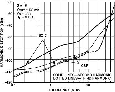 (圖12.AD8099失真比較相同的運(yùn)算放大器在SOIC和LFCSP封裝.)