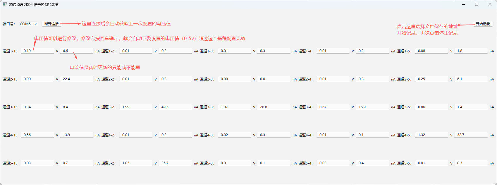 4、上位機交互界面,可以配置每個通道的輸出電壓,實時顯示電流值;且可以保存實驗室數(shù)據(jù)成svc格式文件